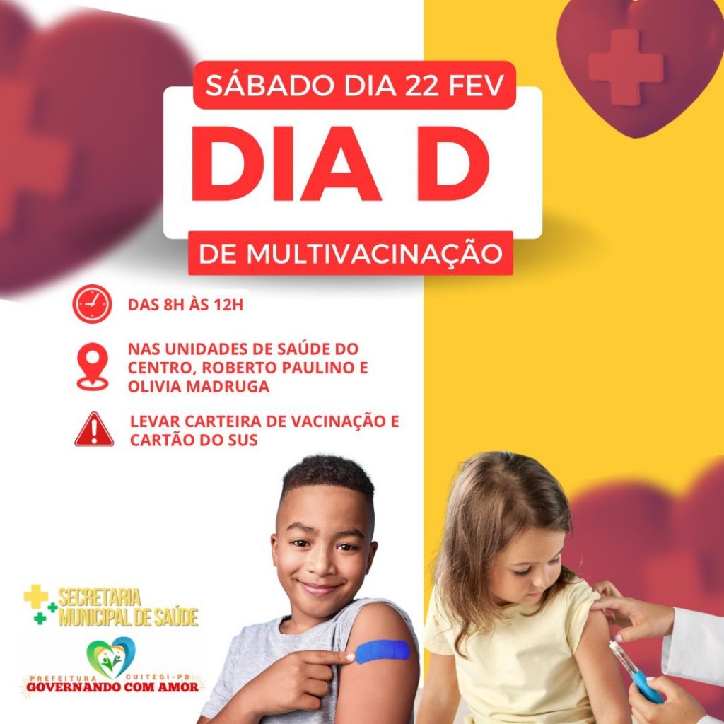 A Secretaria de Saúde de Cuitegi, orienta para a importância de manter a vacinação em dia. Portanto, coloque a vacinação de seu filho em dia. Os locais de vacinação serão no PSF do Olivia Madruga, PSF do centro e PSF do Roberto Paulino.